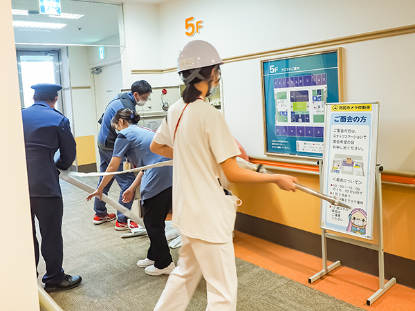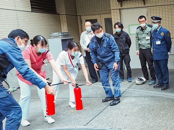 今回は、病棟処置室から出火したとの想定で、初期消火と避難誘導の訓練を行いました。