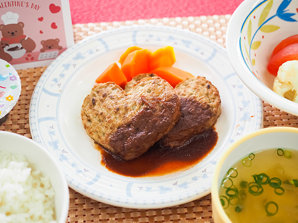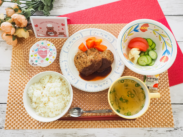 ・ご飯 ・バレンタインバーグ ・温野菜 ・サラダ ・スープ ・チョコレートプリン