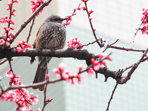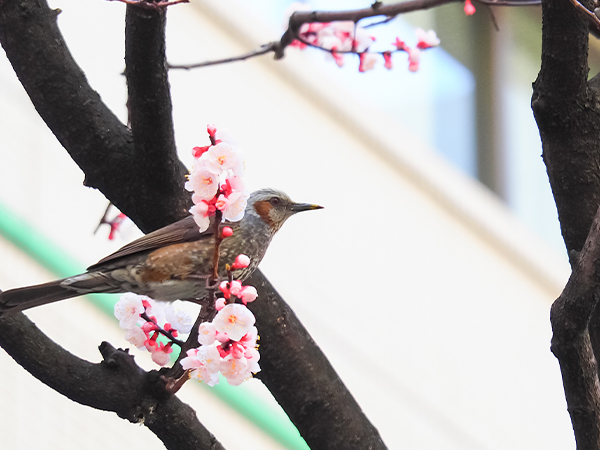 ヒヨドリが元気よく、花の蜜を求めて枝から枝へと飛び回っていました。3/13の写真とは印象が違いますね。本格的な春の訪れを感じます。