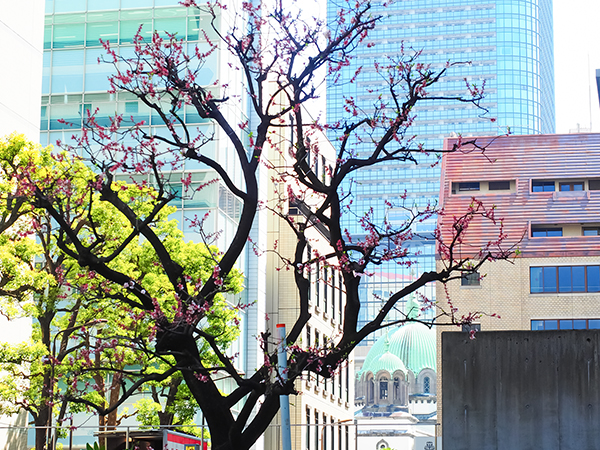 ほぼ散ってしまいましたが、赤い鮮やかなガクも良いですね。気持ちのいい春の日差しの中、建物の間からニコライ堂が綺麗に見えました。