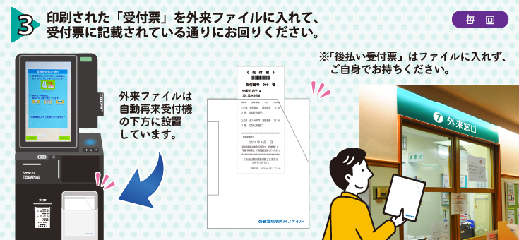 医療費後払いをご希望の方は、来院時「自動再来受付機」で毎回受付が必要です。